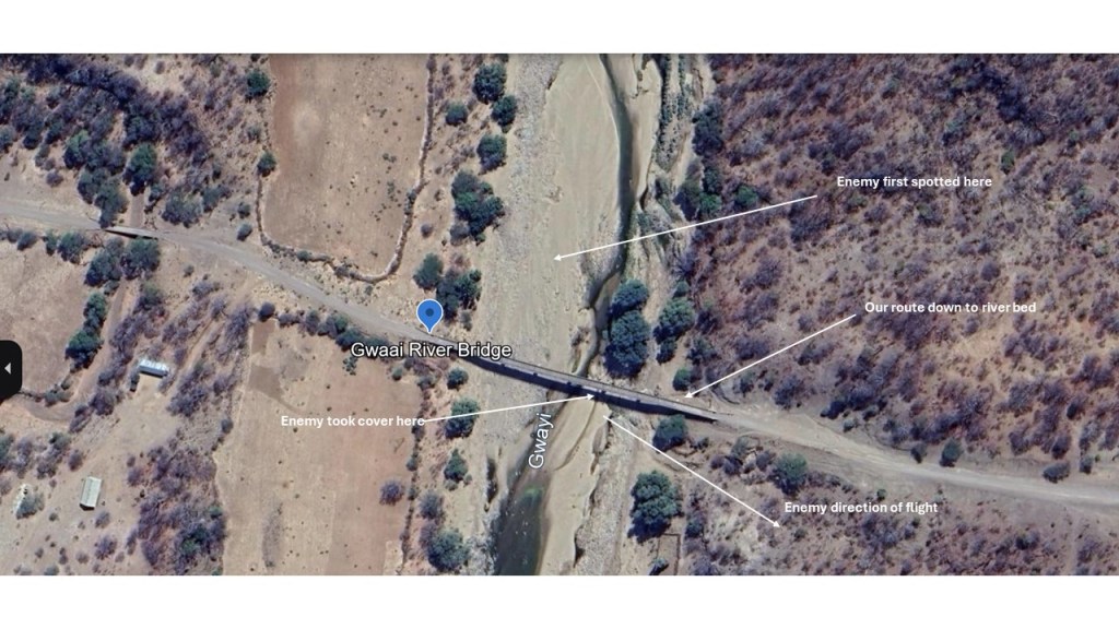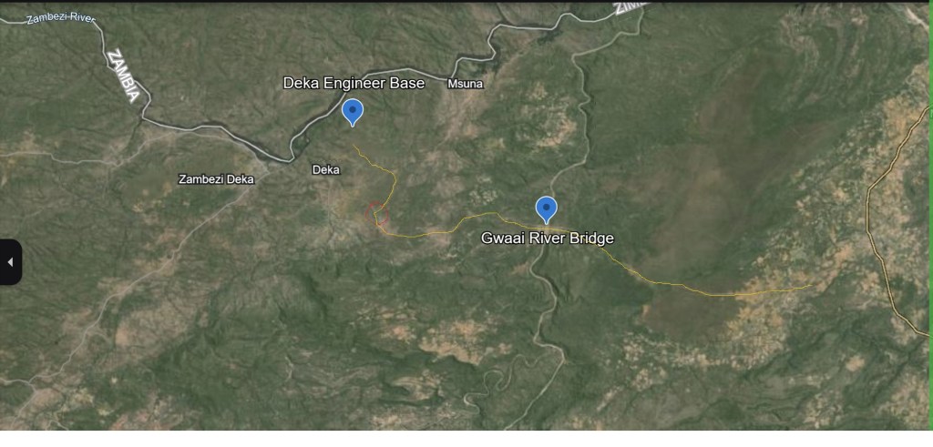 The map below shows the Deka Engineer Base from where we operated from, the intersection (circled in red) where we stopped to make comms with Wankie and cock the Browning’s, and the Gwaai River Bridge. The thin yellow line is the road to the minefield.