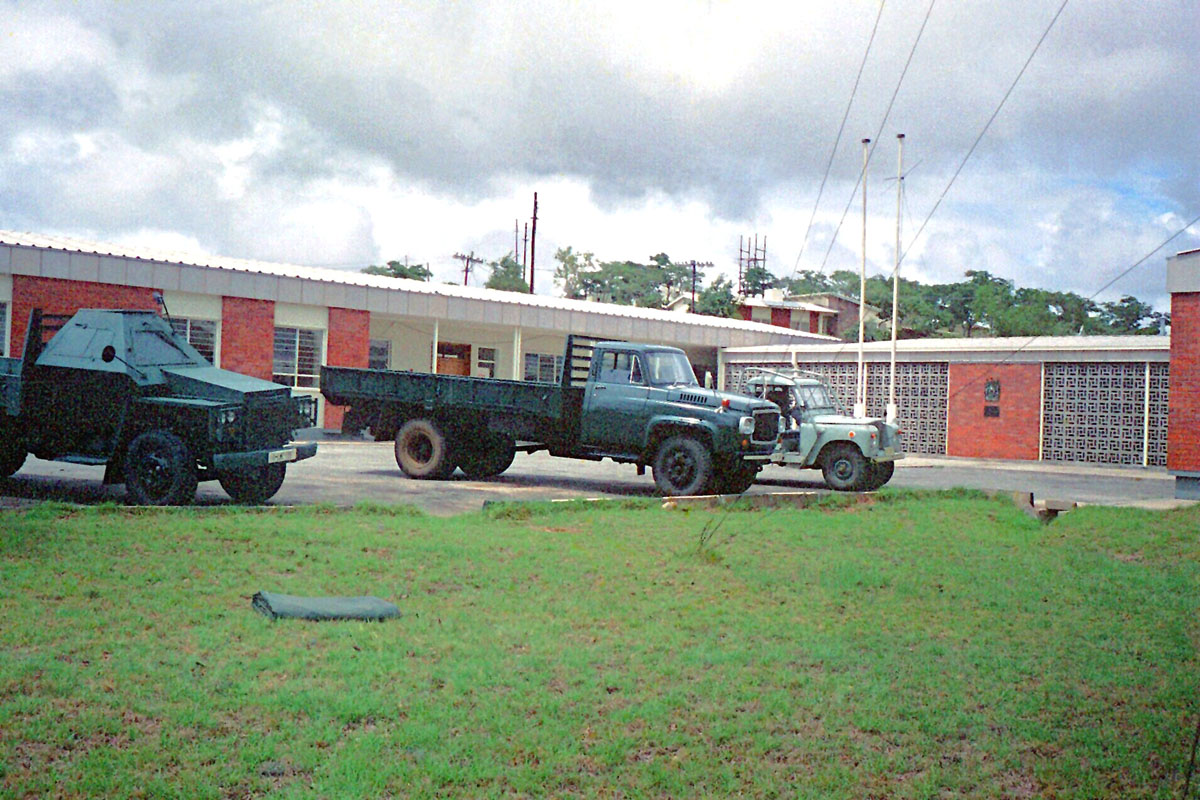 Here is a mine-resistant Land-Rover-note the roll-bars and weapon mount. They had armour-plate inserts in key positions as well. (Tom King at the wheel, taken c. 1977-8 near Chipinga: New Rhodesian)